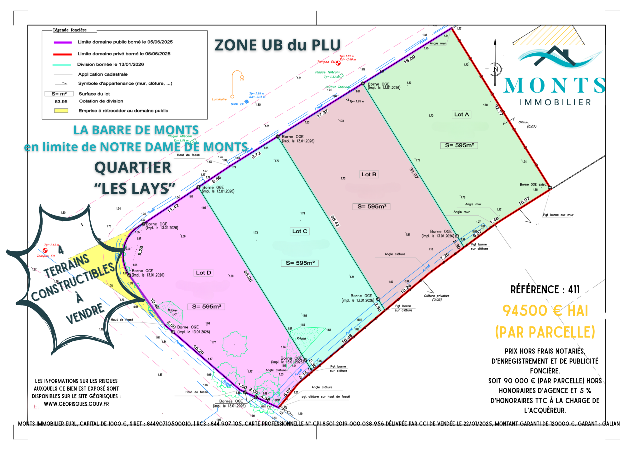 Au calme à 150 mètres de la forêt domaniale de LA BARRE DE MONTS en limite avec la commune de NOTRE DAME DE MONTS et à 2 km de la plage des Lays, 4 terrains constructibles de 595 m², non viabilisés, zone UB du PLU. Emprise au sol non réglementée. Libre de tout constructeur. Chaque terrain est à vendre au prix de 94500 € HAI. Zone B1 du PPRL Les informations sur les risques auxquels ce bien est exposé sont disponibles sur le site Géorisques